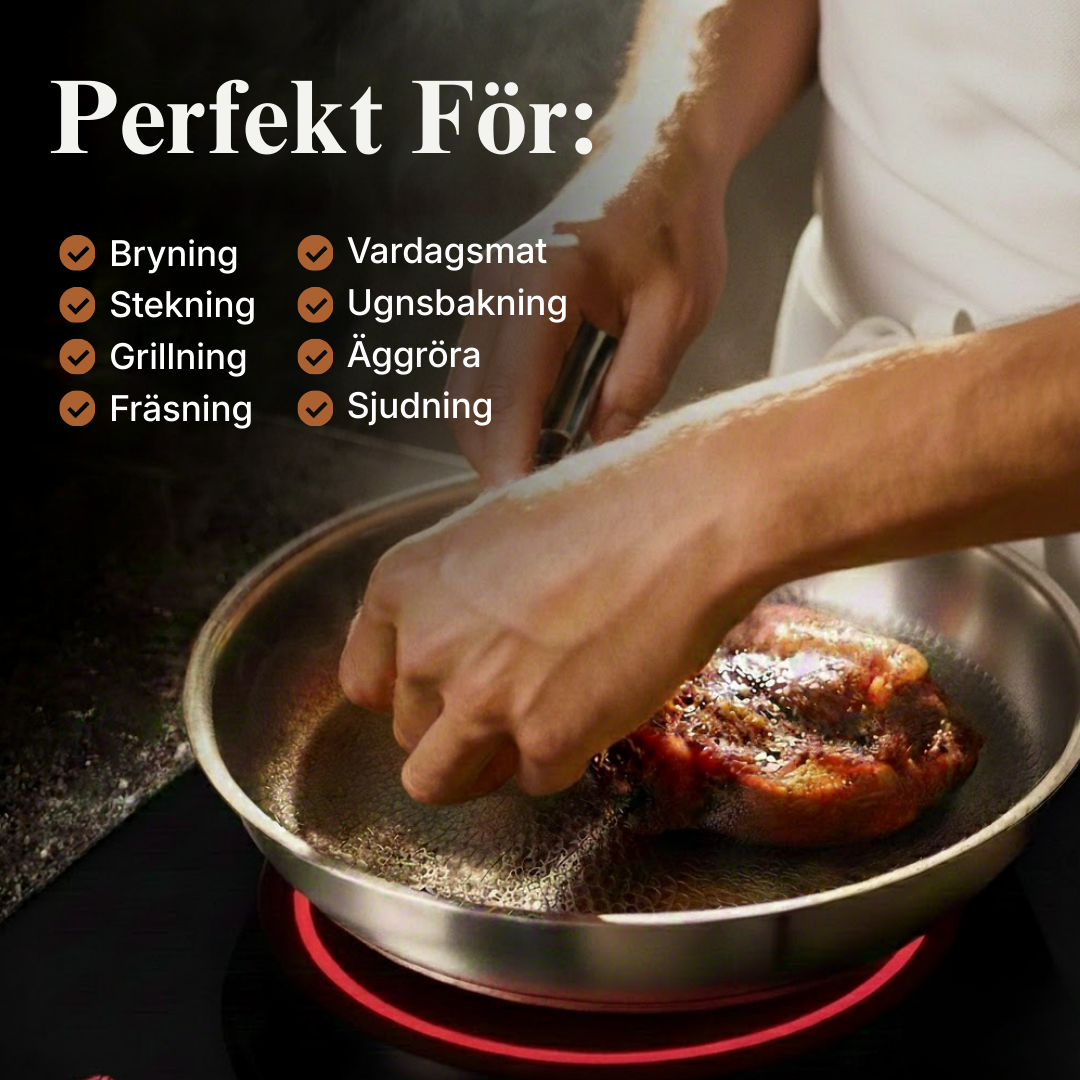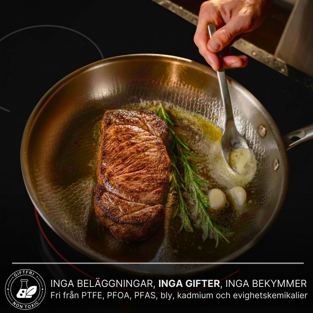 Den hamrade ytan ger professionell värmefördelning och prestanda i klass med världens främsta kockar. Inga beläggningar. Inga gifter. Inga kompromisser.