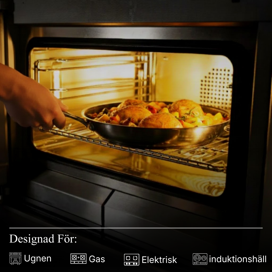 Ja. Titaniums konstruktion gör att pannan klarar höga temperaturer och kan användas direkt i ugnen, perfekt för rätter som går från spis till ugn.